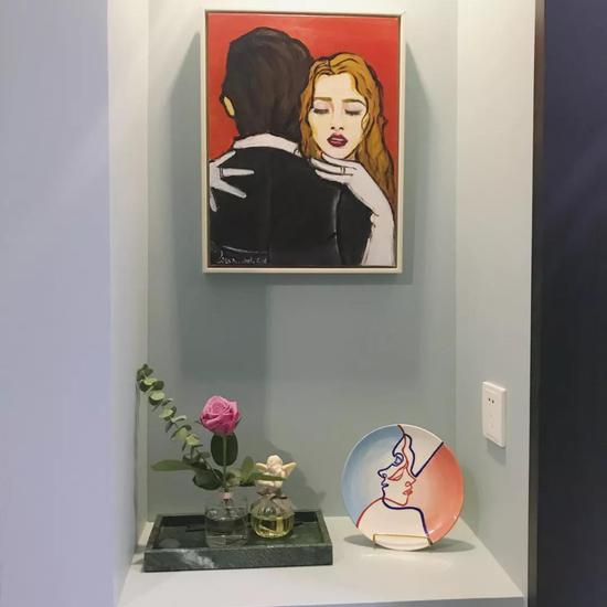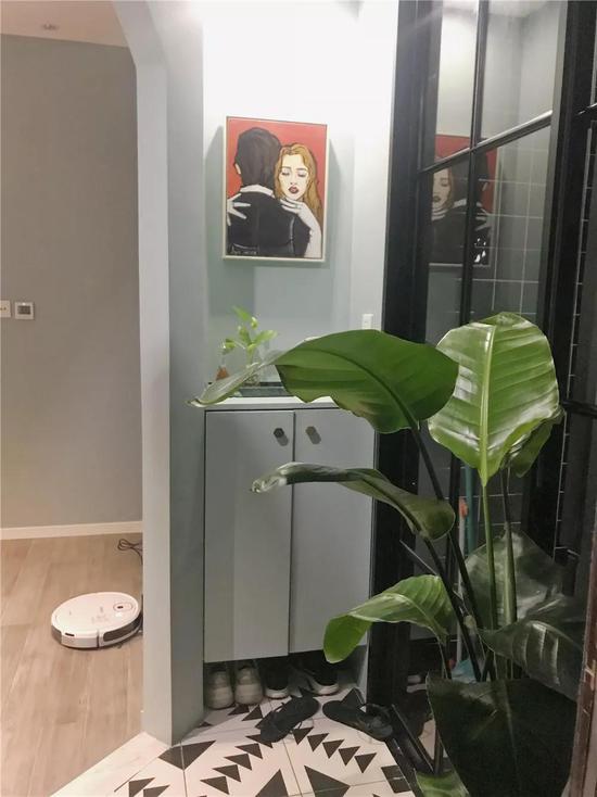 靠近厨房的墙角,根据墙体尺寸定制了小小的鞋柜,满足入户换鞋及放置小物件的需求,鞋柜悬空,下方可以放置当天穿换的鞋子。鞋柜上方以她自己手绘的装饰画和装饰盘做点缀,有点美式复古插画风,色彩明快,让人眼前一亮。