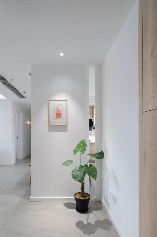屋主一米的家就是这种无玄关的形式,进门向左走是客餐厅,向右走是厨房,中间是一条长且宽敞的走道,因为不想让进门空间显得压抑,就没有做顶天立地的收纳柜,在进门右手边的拐角处放置薄柜,用来满足日常换鞋和随手置物的需求。