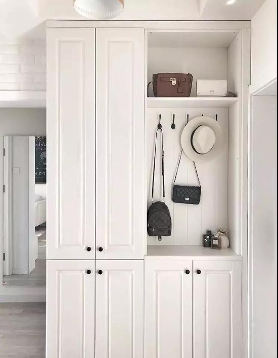 在学习别人家打造假墙或遮挡的柜体时,要考虑到自家公共区域的使用面积,如果面积小,尽量避免使用大型柜体,不然即使拥有了玄关功能,却失去了通透的格局和采光。柜体的细节也要注意,尽量选择底部悬空的下柜,这种柜体在长时间的使用中,内部不容易受潮且容易打扫,留空的底部空间除了可以摆放拖鞋,还能安装灯带渲染气氛。柜子的颜色也要与整体空间保持一致,比如四周是白墙,就搭配白色柜体,与墙体保持一致是最简单的,当然如果对自己的审美有信心,也可以选择搭配其他颜色。
