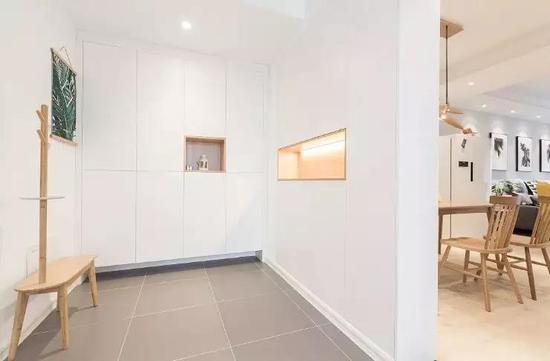 而屋主什么名的家,在将三室改成两室后,公共空间的面积相当宽敞,于是他为了解决入户即厅的问题,直接,做了一组7字形柜子,一边是鞋柜一边是储物柜。正面储物柜兼遮挡作用,储物柜背面是餐厅,背面也用了门板遮挡背板,同时设计了几个壁龛防止沉闷。现在的玄关,可以直接当作衣帽间使用。