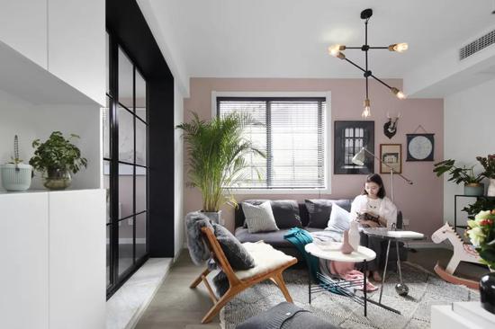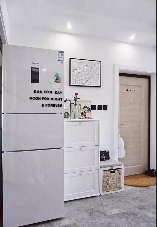 有的小户型由于面积太小,即使进门直面客厅,也没有条件设置遮挡的隔断,这种情况下,如何拥有玄关功能呢?这对90后小夫妻,选择在利用进门左手边的墙面,打造入墙式储物柜,顶天立地的柜子收纳能力强,通体刷白,不会带来压迫感,特别适合在入户空间使用。