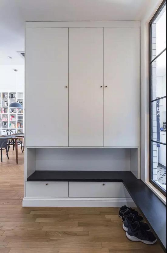 鞋柜与换鞋凳的连接成L型,把进门空间利用到极致,因为玄关与厨房之间隔了一面墙,便在墙面开了一面窄长的窗户从厨房引进自然采光,白天不开灯也可以亮堂堂,避免了因为增设遮挡而采光受限。