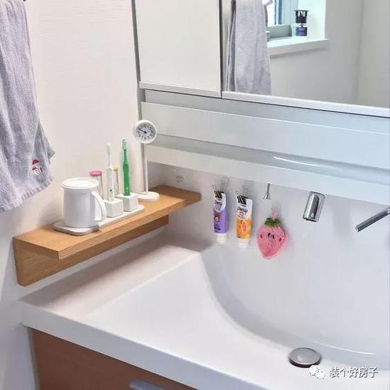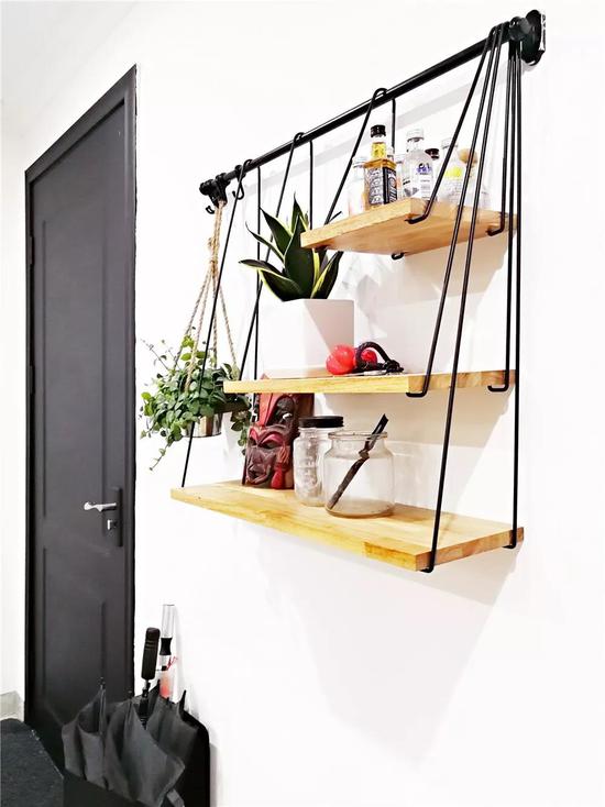 进门右手边的墙面上安装挂杆,摆放木质的搁板,上面可以放置不少小物件。