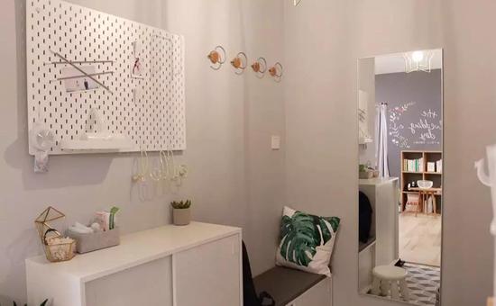 由于进门对面的墙是轻体砖,不能承载定制的柜体,所以买了宜家的鞋柜和卡座摆放在墙边,墙面上只安装洞洞板和挂衣钩,虽然储物能力一般,但能够满足日常需求,进出门时的动线非常方便。