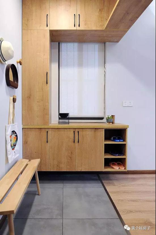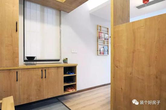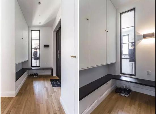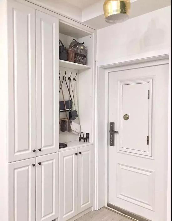 湖南姑娘Hedda同样面临着进门无遮挡的局面,她在进门正对面做了一面隔断墙,打造出了独立的储物空间,装下了80双鞋、50件外套、20个包、10个大收纳箱以及2个行李箱。