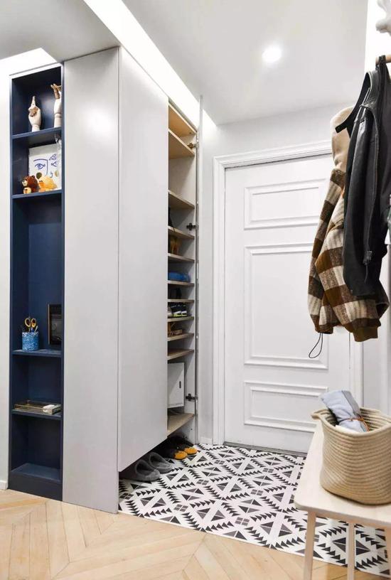 入户门与两侧墙面平行,虽然不占空间且比较敞亮,但缺乏遮挡,室内的场景一览无余,如果不知不得当,容易造成空间杂乱的视觉感受。在布置这类玄关最需要注意的有4点:1.摒弃体积太大、颜色太深、造型复杂等会造成视觉压抑的玄关柜;2.巧妙利用搁板、挂钩等轻巧的收纳用品满足进出门的收纳需求;3.妥善利用墙面空间;4.可以做一个下沉式的玄关,地面铺设花砖与室内相区分,并且容易打扫。