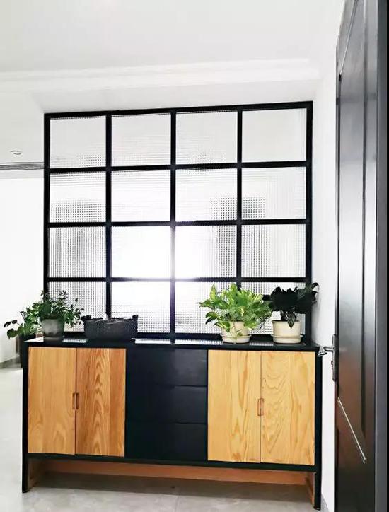 进门正对着餐厅,虽然避免了让客厅一览无余,但是每当全家人在家里吃饭时,客人从外面进来,一眼就能看到饭桌上的餐饭,那种场面也极其尴尬。这个时候一个实用的隔断就很重要了。屋主庄爷的家原本左手边是一个房间,如果增添玄关柜的话,整个客餐厅的空间会变小,加上家里有只大型犬,需要宽敞通透的空间,于是庄爷直接把玄关移到入户门对面,使用鞋柜+黑色方框柜当做隔断,双方格玻璃既能透光又能有私密性,不会一开门就能一眼看到底,并且玻璃隔断简洁好看,黑框与磨砂的元素又增添了精致感。