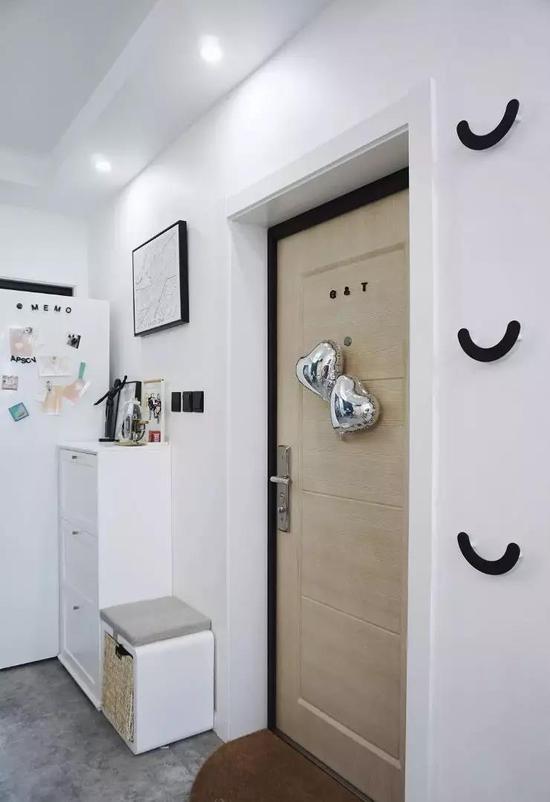 屋主TorieZ的家也是这种情况,但是她的家公共区域面积更小一点,便直接用玄关的必备家具来造出玄关功能,木色的防盗门右手边放置鞋柜和换鞋凳。