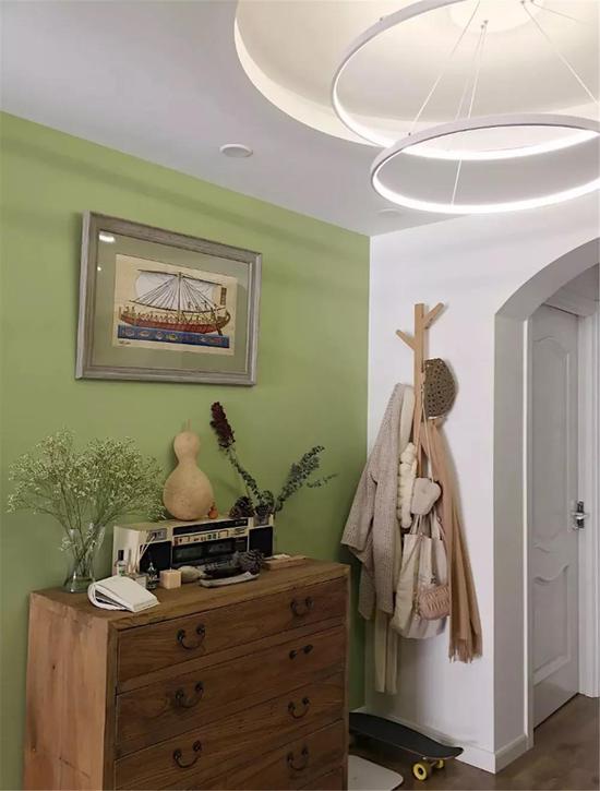 入户门对面放置实木收纳柜,又利用墙角空间安装衣架,背景墙面涂刷成橄榄绿,正好起到突出区域的作用。