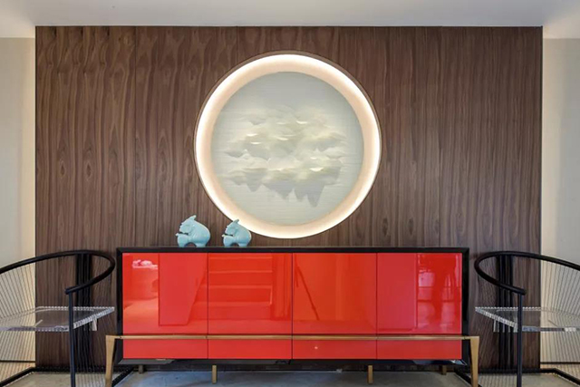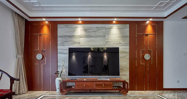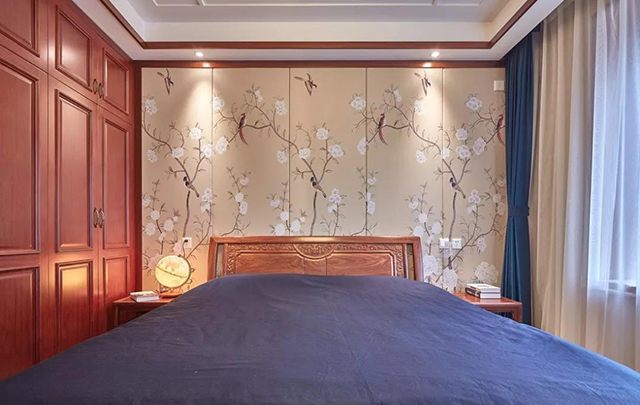 中式讲究对称,灵活嵌入花鸟虫鱼水墨画,博古架也是背景墙设计的首选,使空间更加丰富。