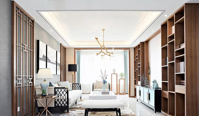 中式客厅,天花以木条相交成方格形,上覆木板,也可做简单的环形的灯池吊顶,用实木做框,层次清晰,漆成花梨木色。随着设计元素的变化,渐渐的就只简单的弄个石膏线或者平顶。沙发背景画多选择水墨字画,家具多以木质为主。